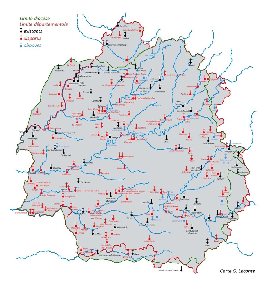 Carte des monastères du Périgord, travail personnel communiqué par Gérard Leconte