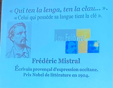La toponymie, mot issu du grec ancien (topos =lieu et nomos =nom) est l’étude des noms de lieux. La recherche toponymique, en mêlant histoire, géographie et linguistique enquête sur les indices laissés par les sociétés passées sur les territoires. Pour prouver l’importance de cette science peu connue, elle cite une phrase de l’écrivain et lexicographe Frédéric Mistral qui s’exprimait en provençal et fut un fervent défenseur des langues occitanes.