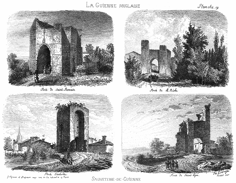 Sauveterre-de-Guyenne est construite sur le modèle typique des bastides. Entourée d’une enceinte dont il ne subsiste rien, en dehors de quelques fragments de murailles accrochés aux portes, elle possède quatre portes qui existent toutes encore : les portes Saubotte, Saint-Romain, Saint léger et de la Font (photos : les portes de Sauveterre-de-Guyenne en 1860 par Léo Drouyn