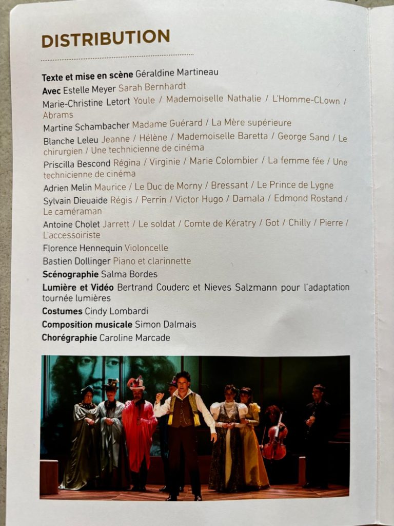 Dans un décor ingénieux, dix artistes interprètent trente-cinq personnages pour dérouler la vie de la flamboyante Sarah Bernhardt. Les tableaux s’enchaînent, les décors se transforment. De l’adolescente arrivant chez sa mère demi-mondaine à Paris à la tournée américaine, en passant par ses tumultueux passages à la Comédie-Française, ses prises de position durant l’affaire Dreyfus et son image de première star internationale, Géraldine Martineau revient magistralement sur le parcours atypique d’une femme extraordinaire et extravagante. Estelle Meyer est Sarah Bernhardt, dans ses fêlures, ses excès et ses excentricités.